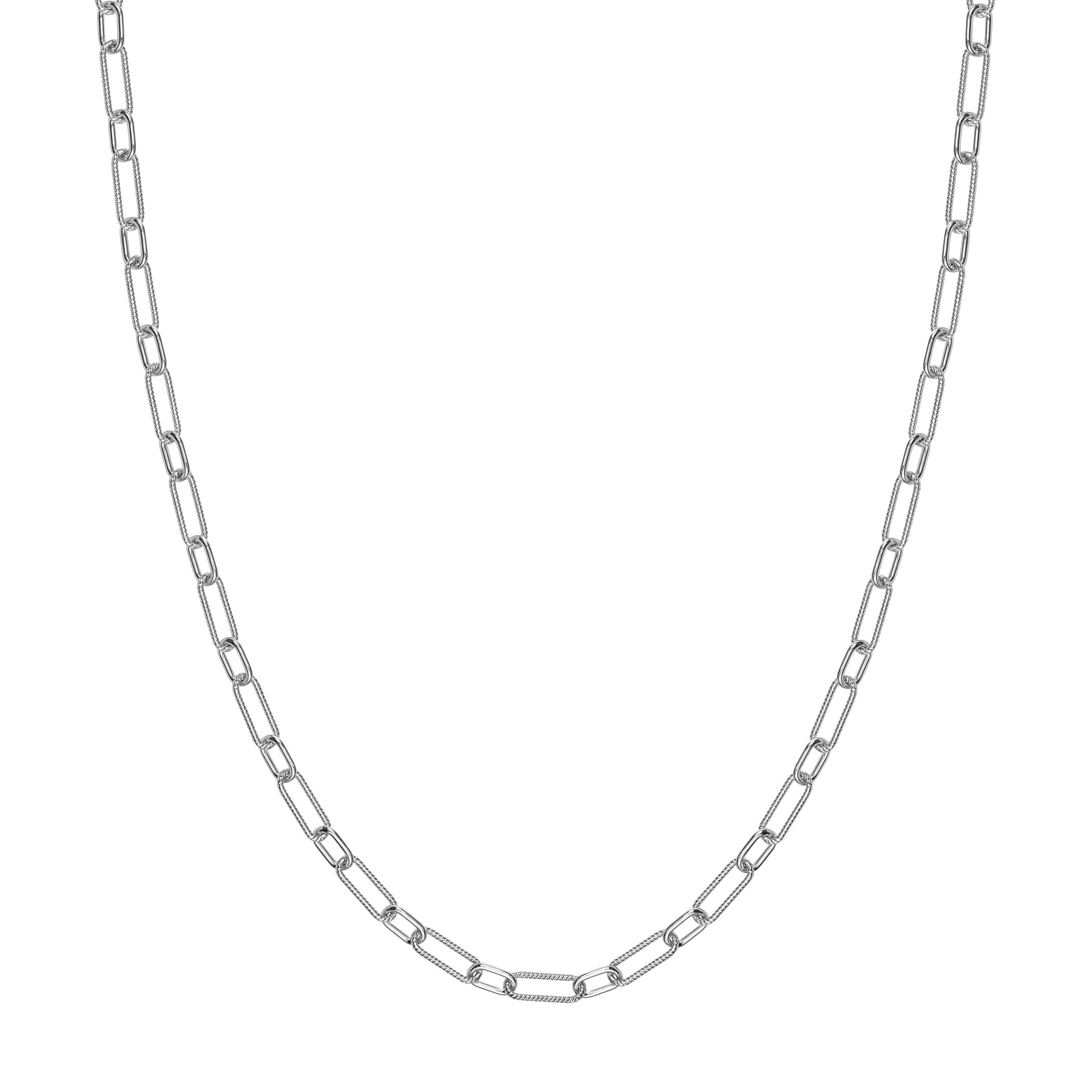 An iconic chain with a modern twist–wear this 4.35mm twisted paper clip chain. Add a smooth and sleek texture to your stack. Crafted in rhodium plated Sterling Silver.