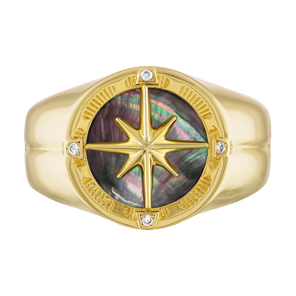 For the intrepid soul symbolically navigating place and time, the Bulova Marine Star collection is inspired by both compass and clock. Ring is made of 14K gold-plated sterling silver inlaid with black mother-of pearl and accented with four white diamonds totaling 0.02 CTTW. Side etched with Bulova signature tuning fork logo. Ring face measures 18MM in diameter. Size 10.