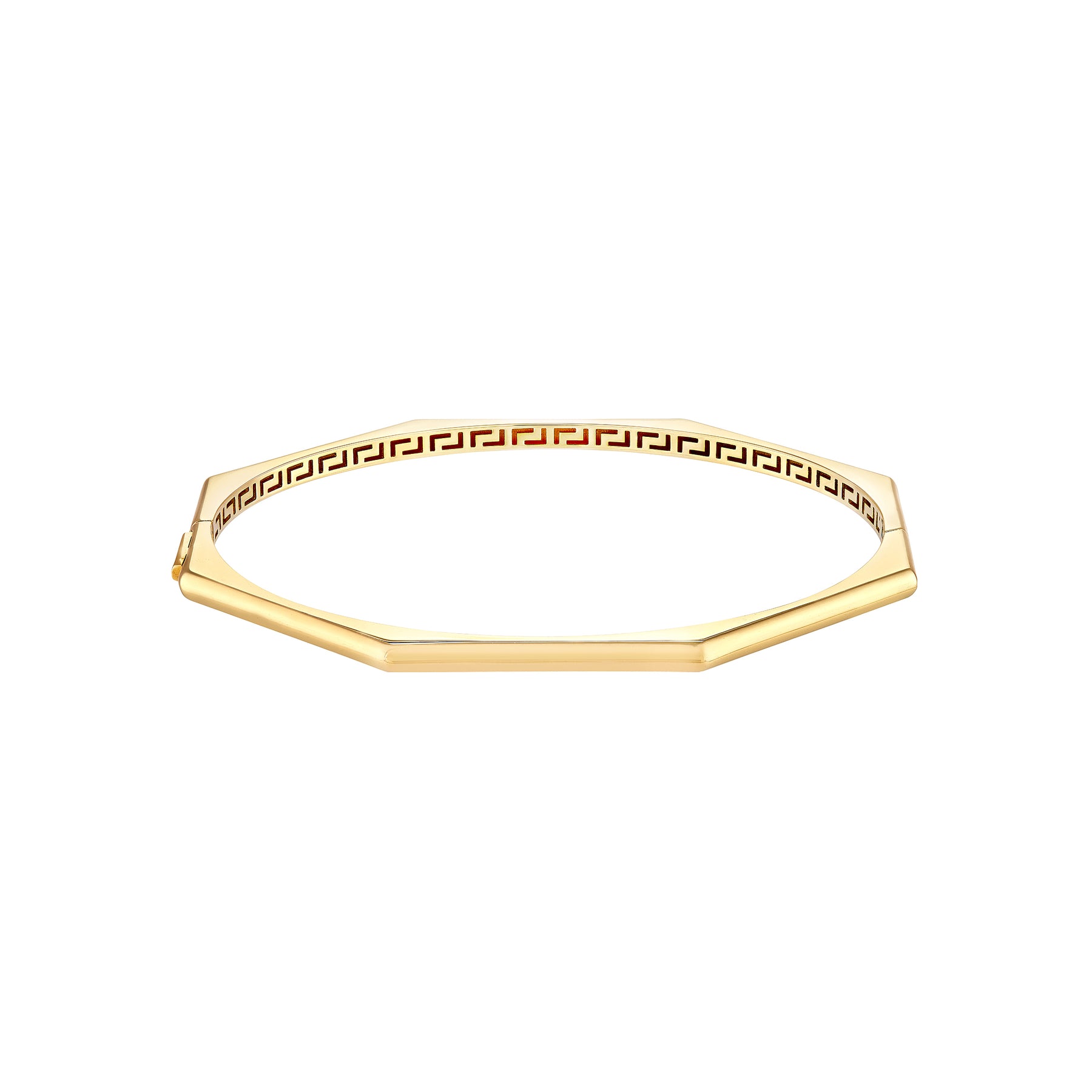 A classic bangle in 10 & 14 Karat gold with a hinged clasp is specially made for you. It's geometric shape with greek key interior design doesn't go unnoticed, like you.