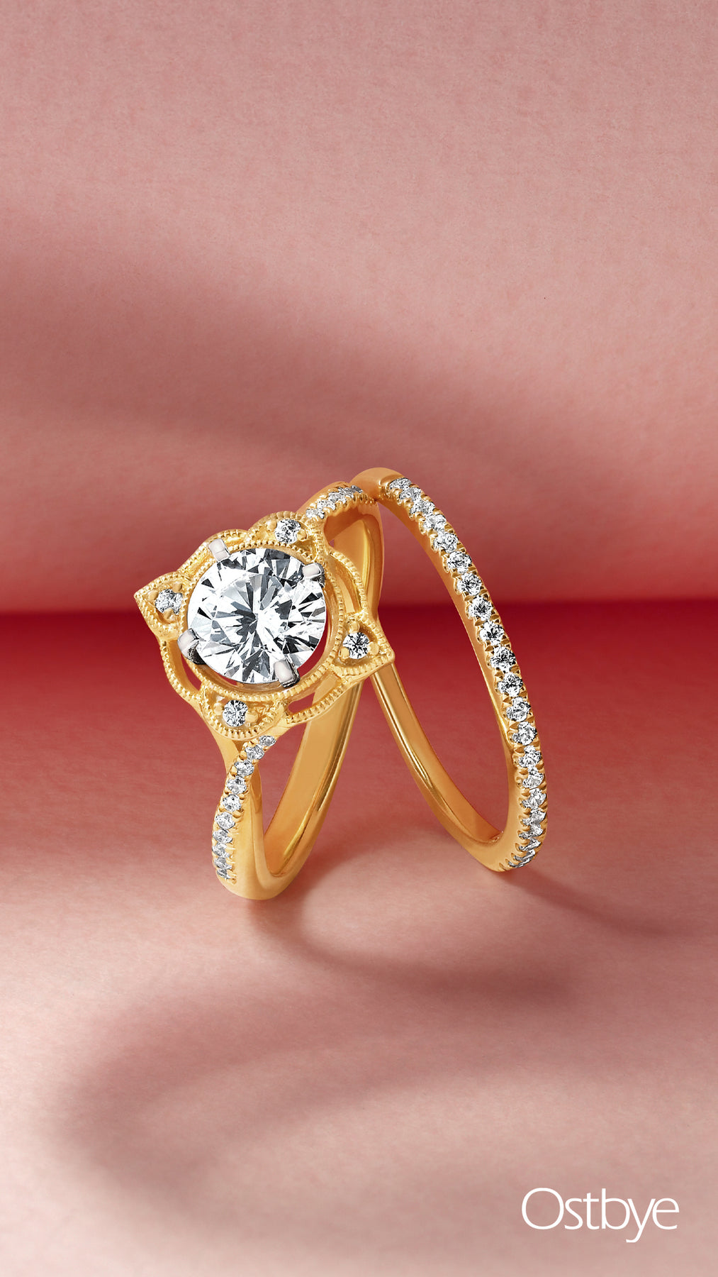 Engagement Ring: Forever Elegant® 1/10 Ctw. Diamond Semi Mount shown with 3/4 Ct. Round Center Diamond in 14K Gold shown with Forever Elegant® 1/8 Ctw. Diamond Wedding Band in 14K Gold - Items also available to purchase separately