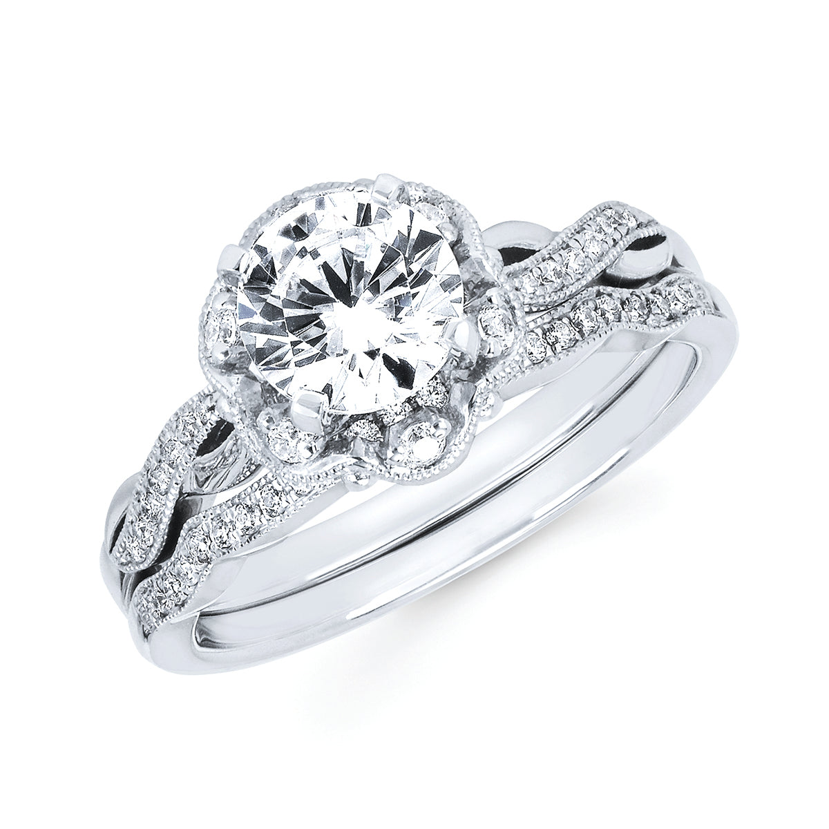 Forever Elegant® 1/10 Ctw. Diamond Semi Mount shown with 1 Ct. Round Center Diamond in 14K Gold Forever Elegant® .08 Ctw. Diamond Wedding Band in 14K Gold Items also available to purchase separately