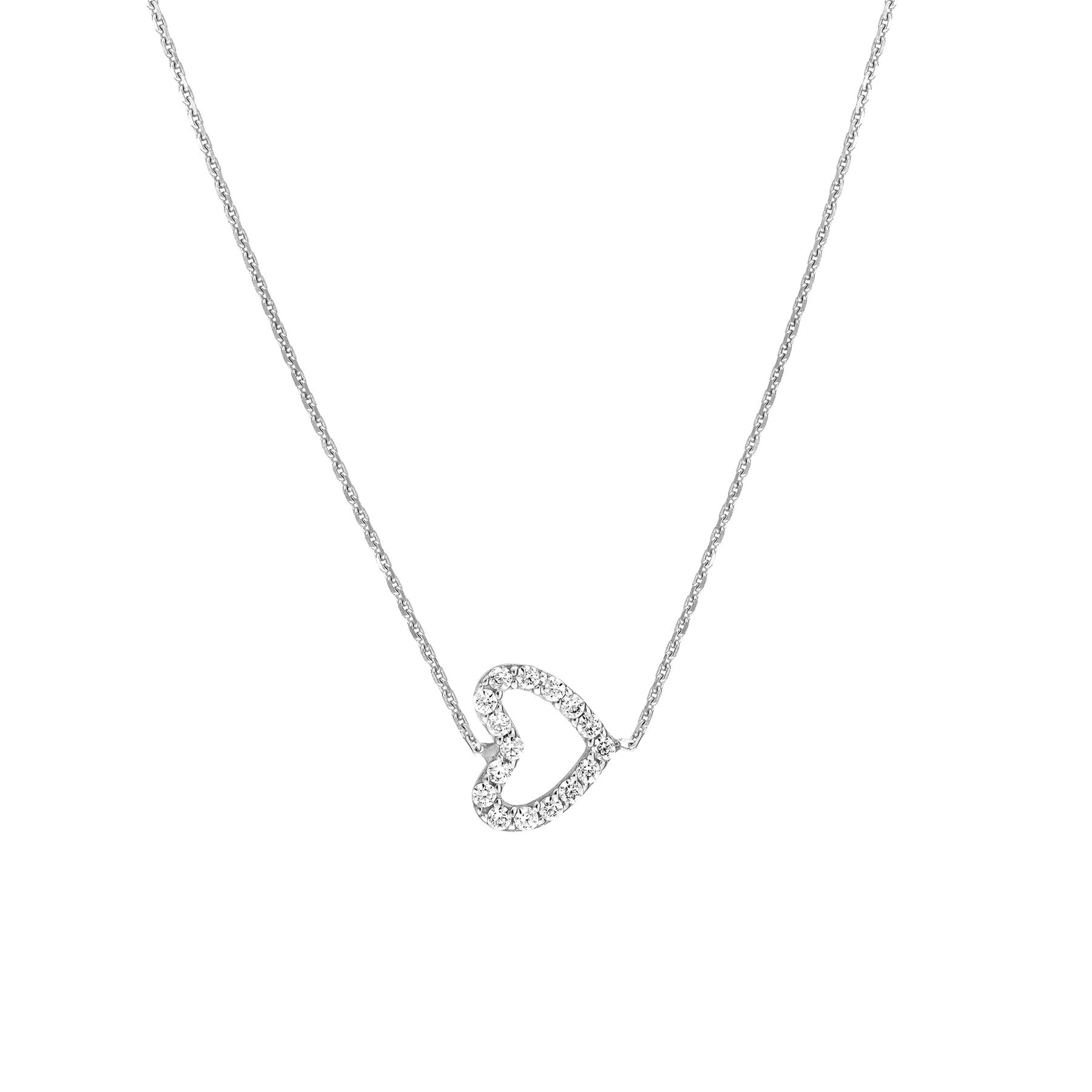Always hold love close to your heart. This sideways mini CZ open heart necklace hangs on an adjustable chain. Crafted in Sterling Silver. Plated in rhodium, yellow gold or rose gold.