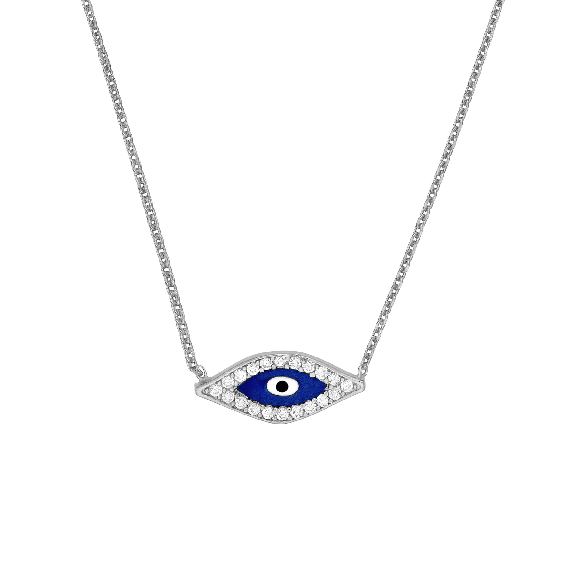 Add a unique touch to your jewelry by including an evil eye lined with cubic zirconia stones. Crafted in Sterling silver. Silver color plated in Rhodium; Yellow and Rose flash plated in 14K gold.