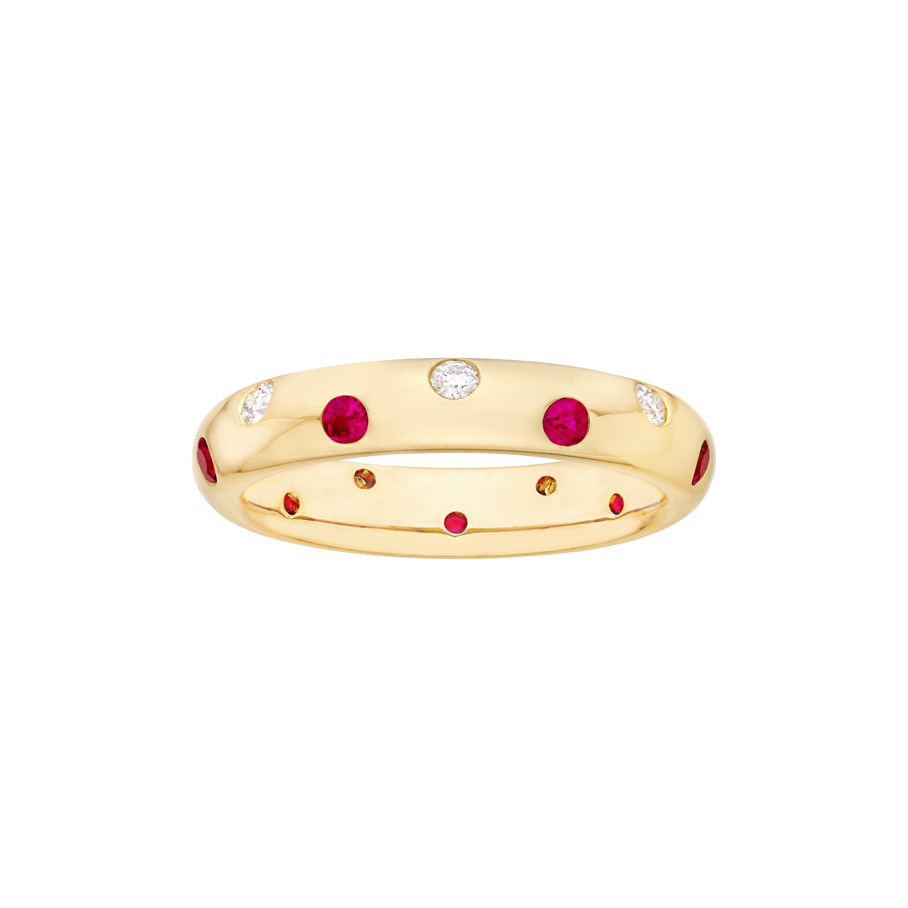 This band offers a modern twist on classic elegance. Featuring 2mm diamonds and rubies, this puffy ring is made-to-order with a comfort band.