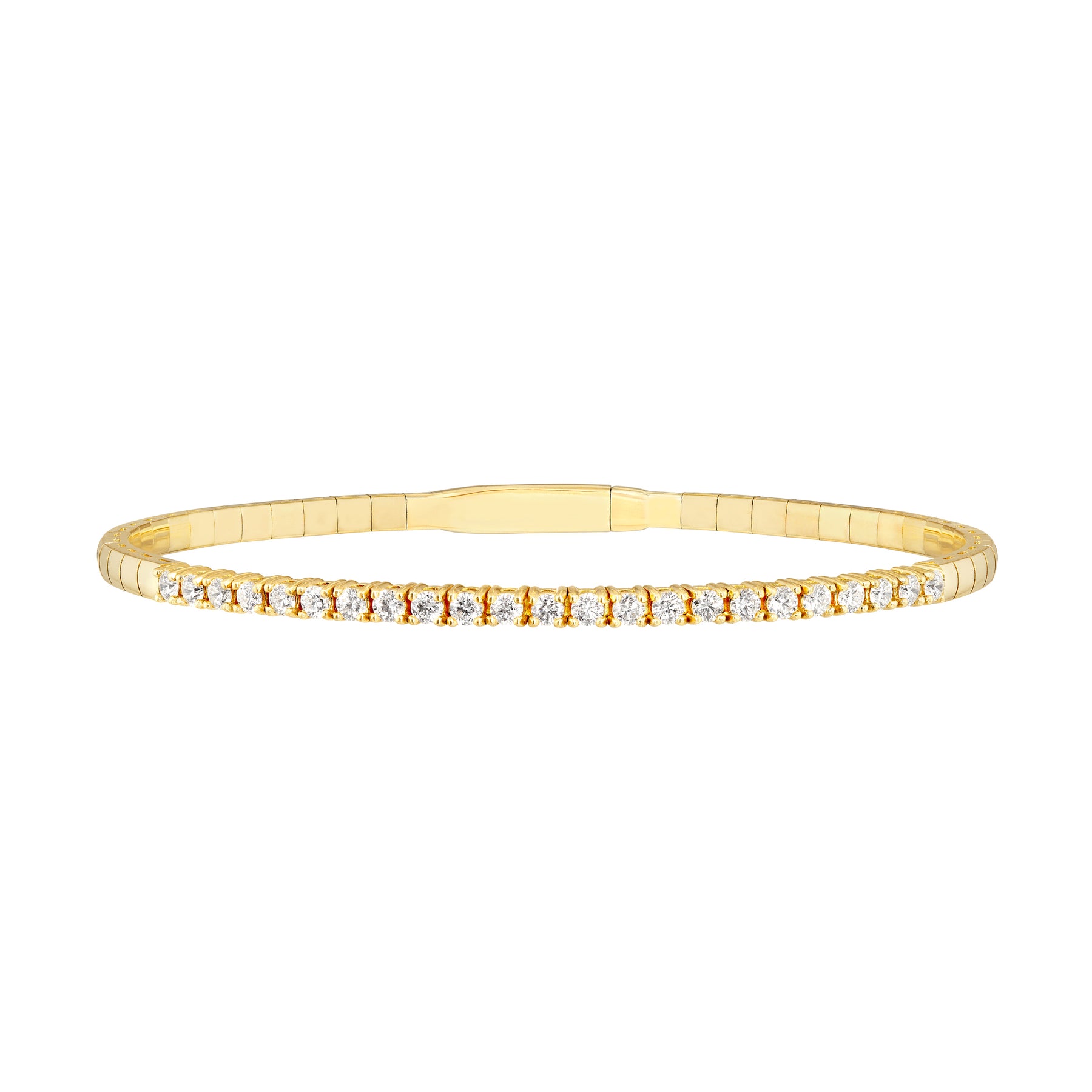 Add a touch of elegance to your wrist stack with this stunning piece from our Tennis collection. This 1tcw, 2.2mm diamond bracelet features diamonds halfway around the flexible bangle.