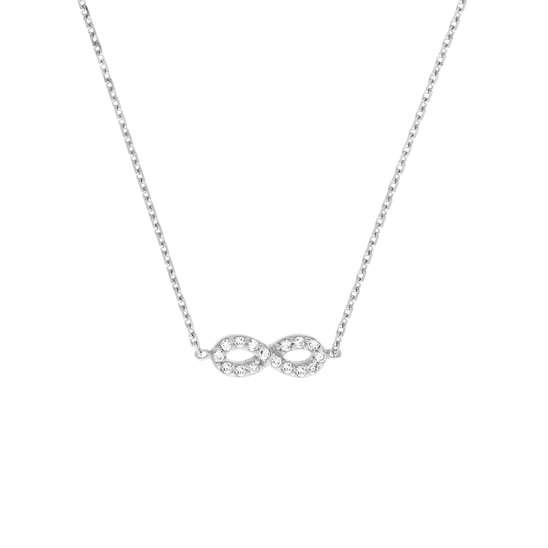 Hold this timeless infinity symbol close to your heart. This CZ mini infinity symbol necklace hangs on an adjustable chain. Crafted in Sterling Silver. Plated in rhodium, yellow gold or rose gold.